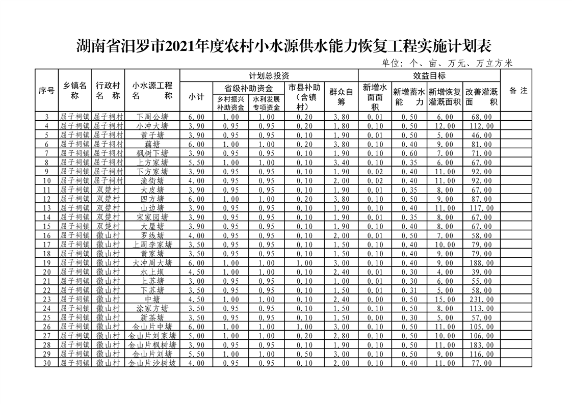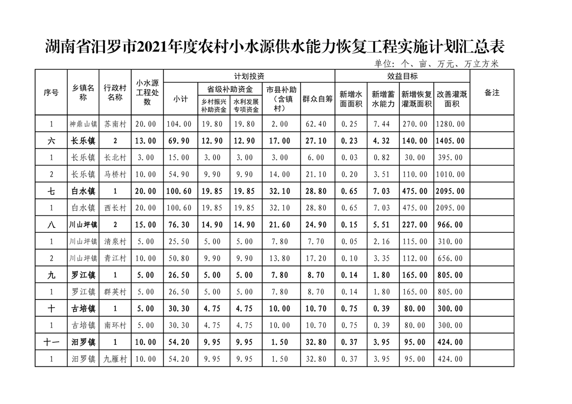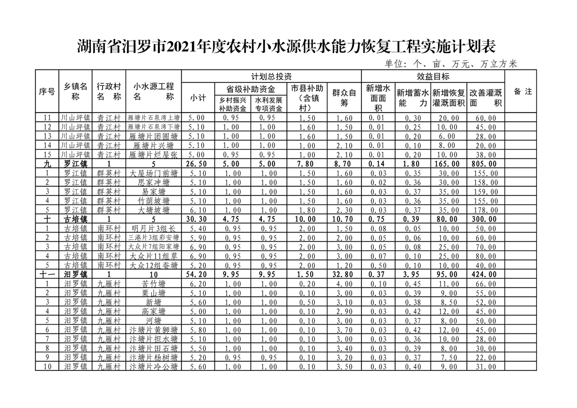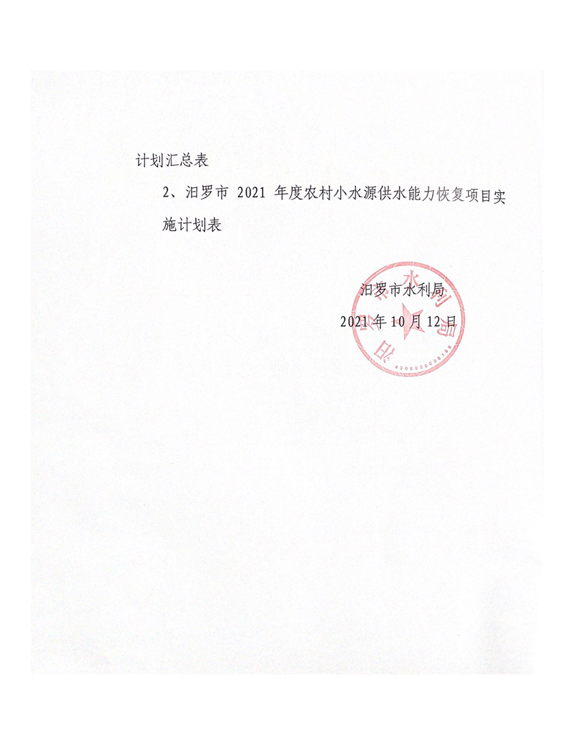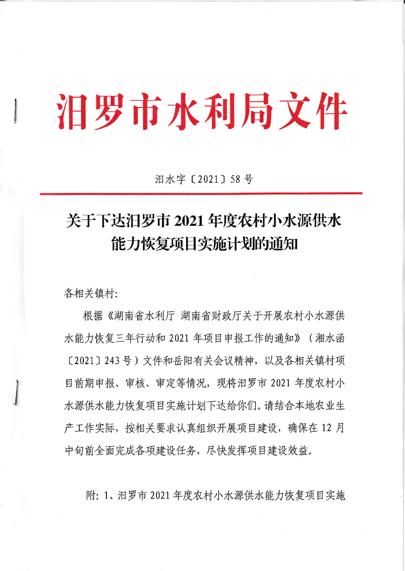 关于下达汨罗市2021年度农村小水源供水能力恢复项目实施计划的通知