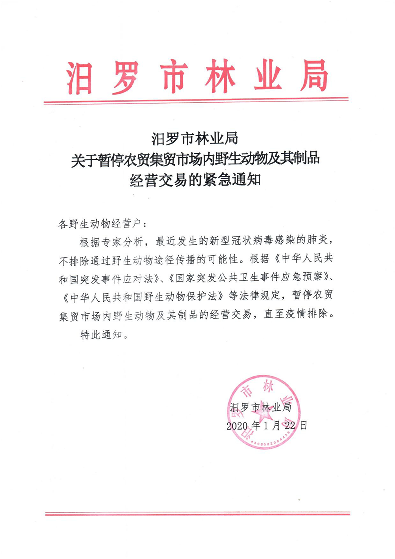 汨罗市林业局关于暂停农贸集贸市场内野生动物及其制品经营交易的紧急通知