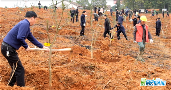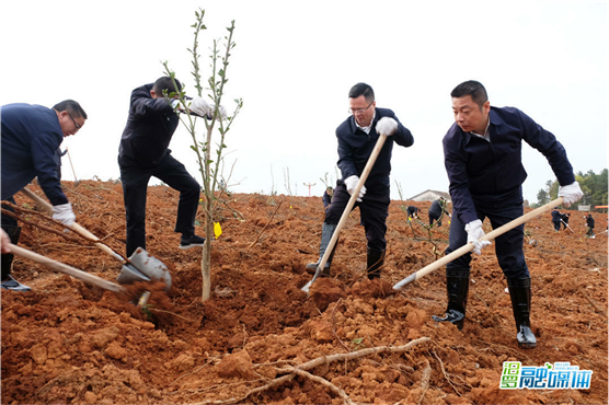 三月汨罗,春光明媚,一派生机勃勃景象。一早来到植树现场,喻文、朱平波拿起铁锹和大家一同投入到火热的劳动中。铲土填埋、扶苗夯实,大家配合默契、有条不紊,干得劲头十足,1个小时就栽种了500株黄金柚。