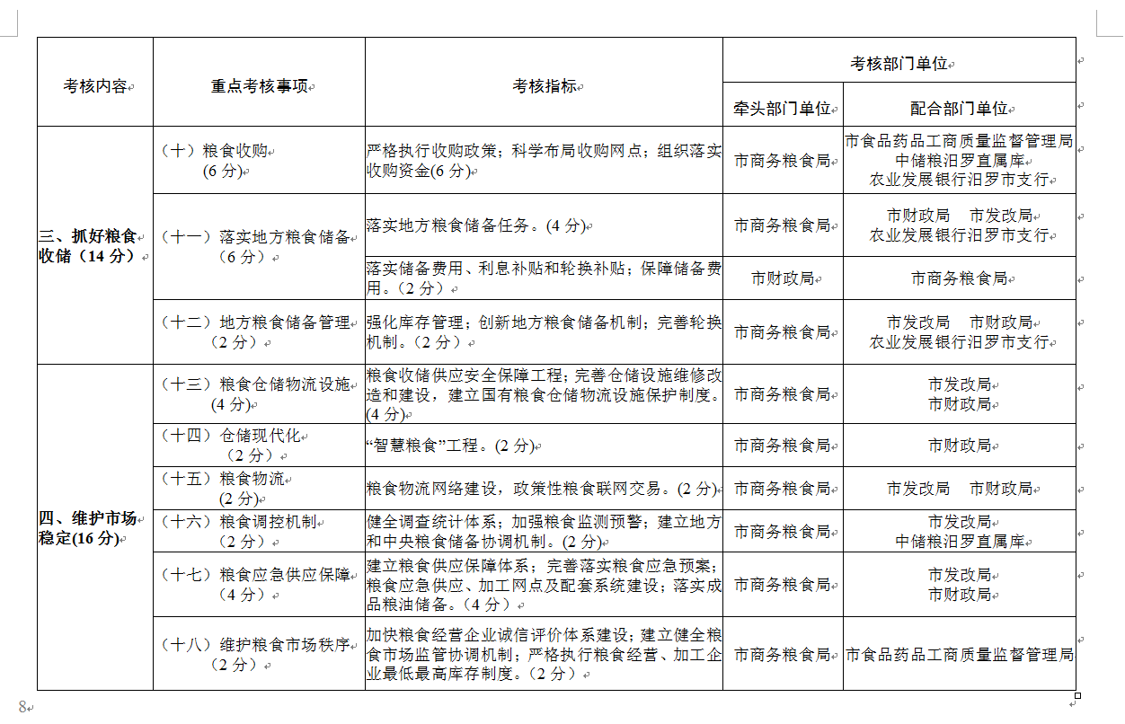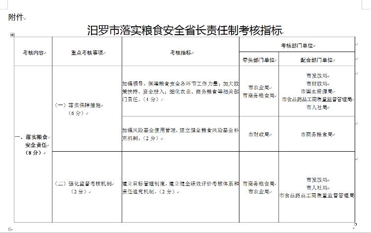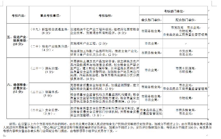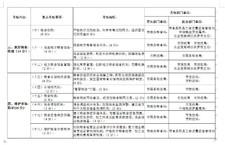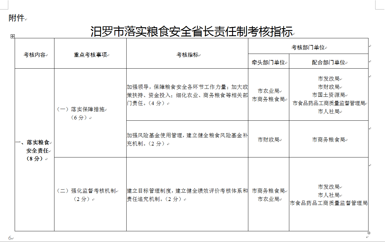 重点考核事项和指标详见《汨罗市落实粮食安全省长责任制考核指标》