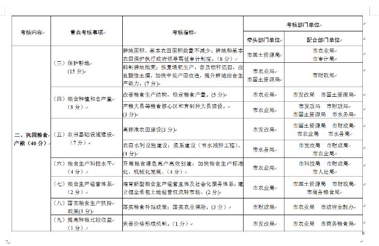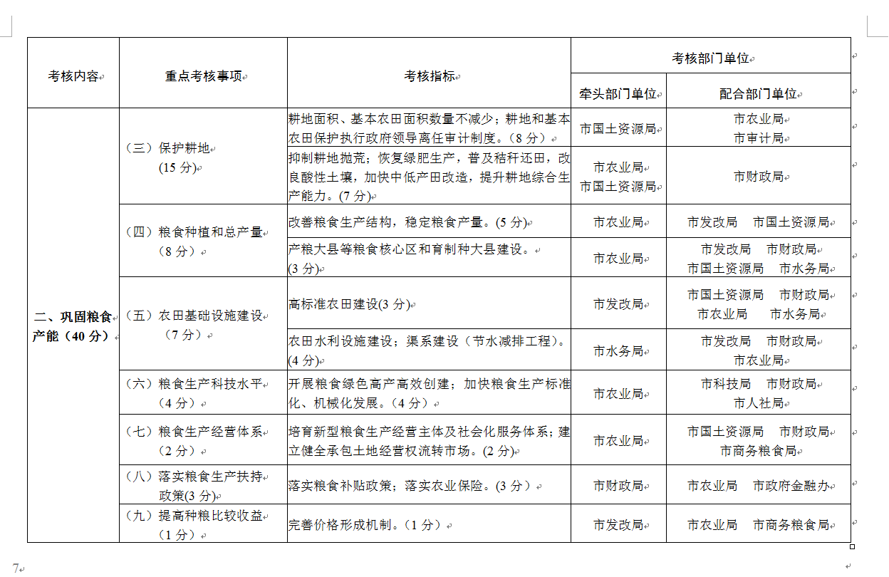 (一)落实粮食安全主体责任。保障粮食安全各环节工作力量,建立健全粮食风险基金补充机制,加大政策扶持,建立目标管理制度,建立绩效评价考核体系和责任追究机制等。