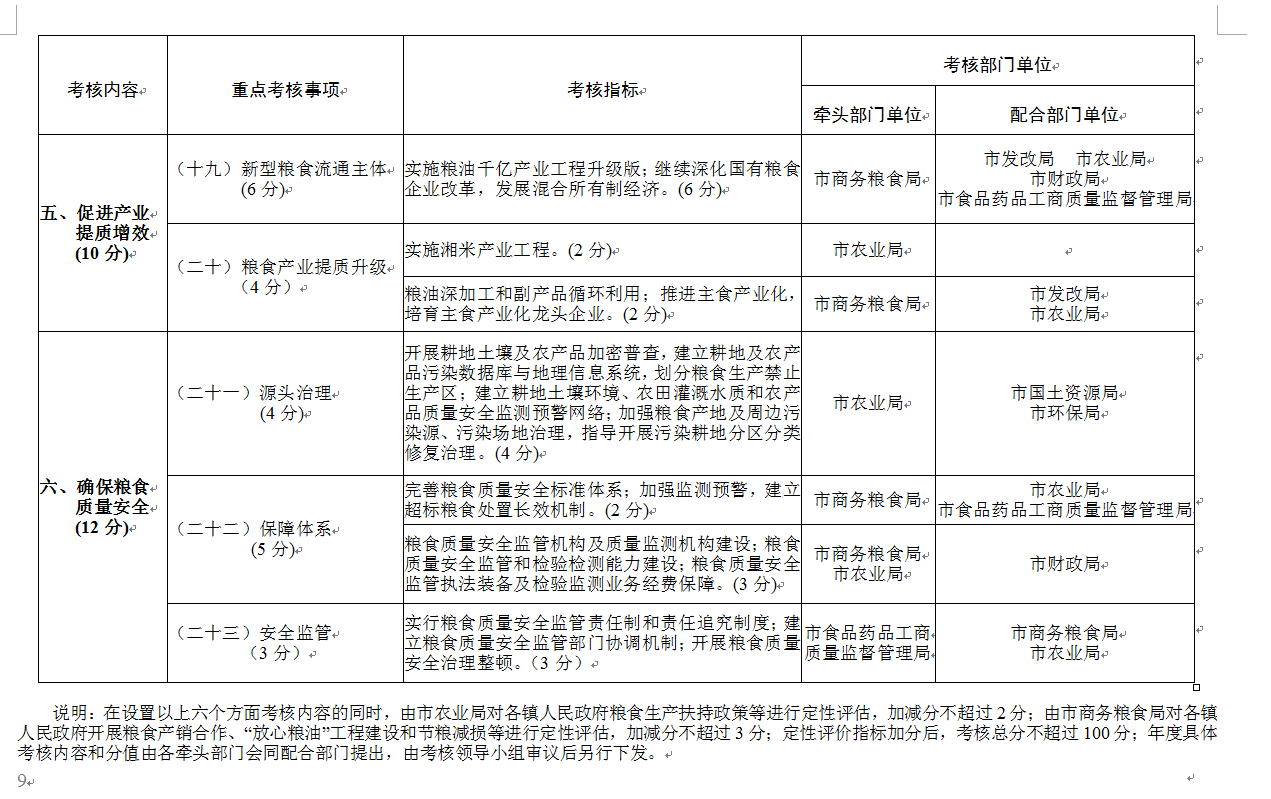 第九条 各牵头部门要会同配合部门单位,依据《汨罗市落实粮食安全省长责任制考核指标》,结合年度重点工作任务,提出年度各项考核指标的具体考核内容和分值,经考核领导小组审核汇总后,于每年5月31日前印发《汨罗市落实粮食安全省长责任制年度考核细则》。