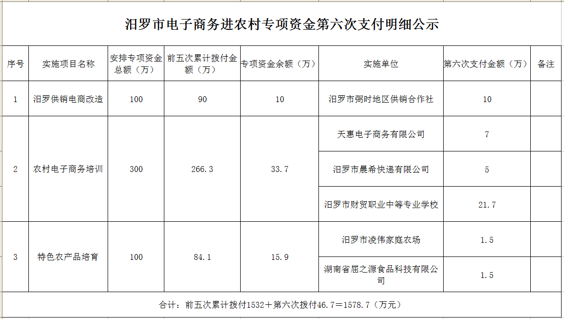 汨罗市电子商务进农村专项资金第六次支付明细公示
