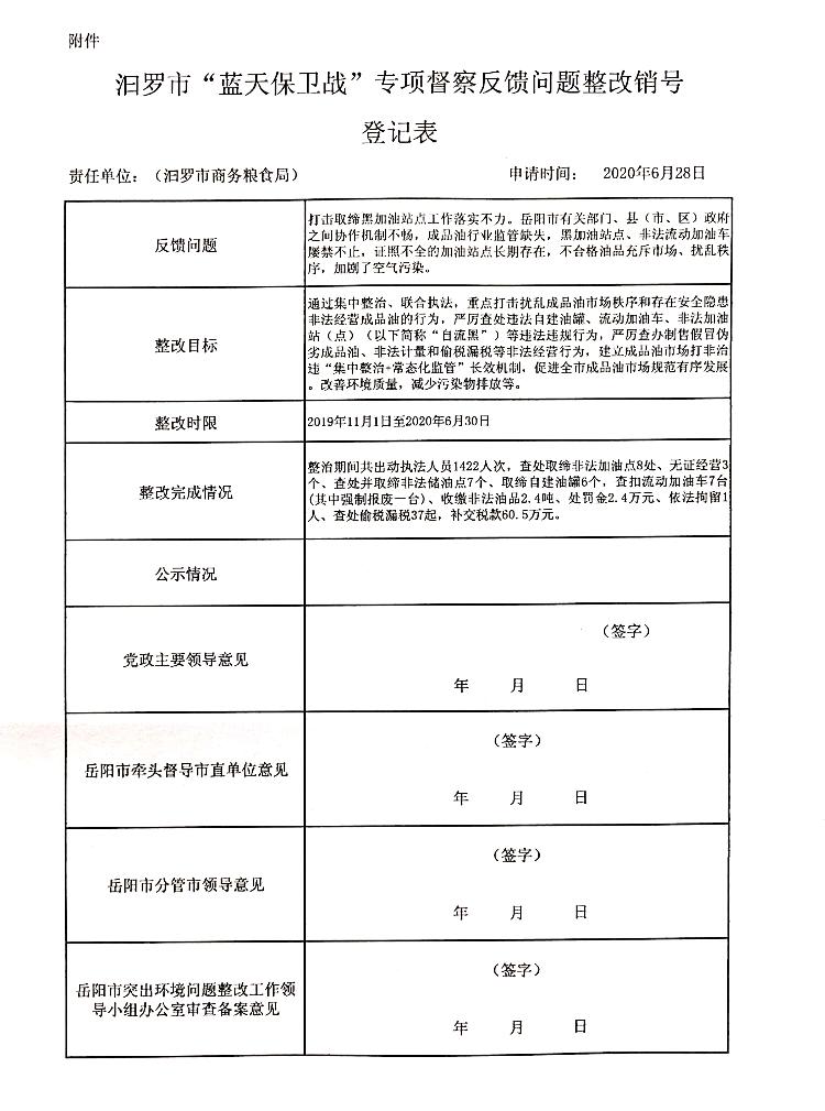 汨罗市“蓝天保卫战”专项督察反馈问题整改销号登记表公示