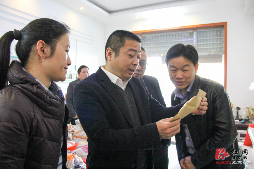 朱平波(左二)、宋辉(右一)在邮乐购汨罗镇网点了解电子商务进农村示范项目开展情况