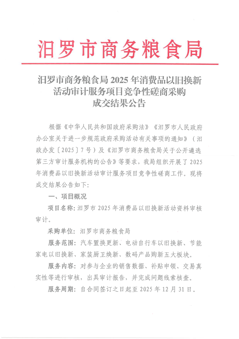 汨罗市商务粮食局2025年消费品以旧换新活动审计服务项目竞争性磋商采购成交结果公告