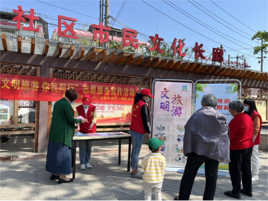 活动中,志愿者向社辖区居民发放文明旅游宣传资料,面对面普及维护环境卫生、遵守公共秩序、爱护公共设施等文明旅游知识,宣传“文明出行、绿色旅游、爱护环境”理念,倡导居民争做文明旅游的守护者和践行者,养成文明、绿色的旅游习惯,传播文明新风,共同打造清新、宜人的旅游环境。