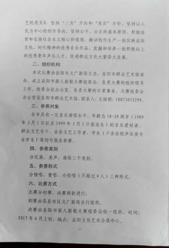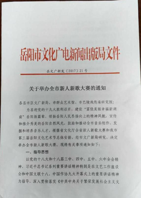 各镇、市直各单位及相关个人: 现将岳阳市文广新局《关于举办全市新人新歌大赛的通知》予以转发,请相关单位与个人根据要求报名。 报名联系人:汨罗市文旅广新局文艺创作股陈志敏; 联系电话:13807407619 截止时间:2017年5月24日下午5:00 附:岳阳市文广新局《关于举办全市新人新歌大赛的通知》 汨罗市文旅广新局 2017年5月22日