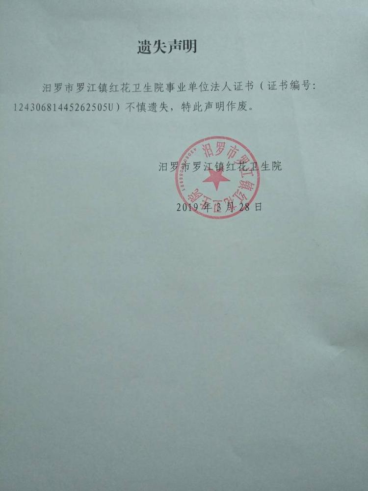 汨罗市红花卫生院事业单位法人证书遗失声明