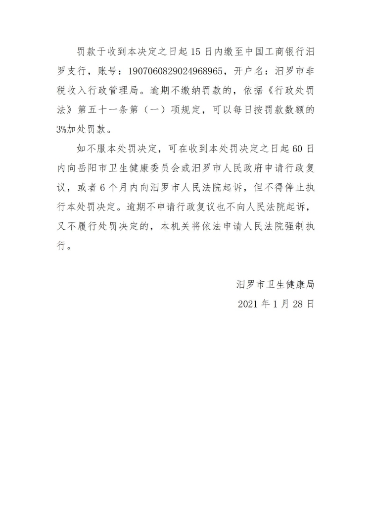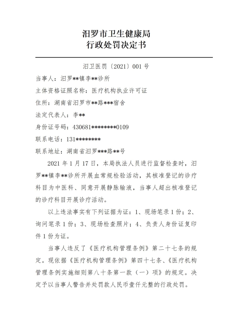 汨罗市卫生健康局行政处罚决定书(汨卫医罚2021年001号)
