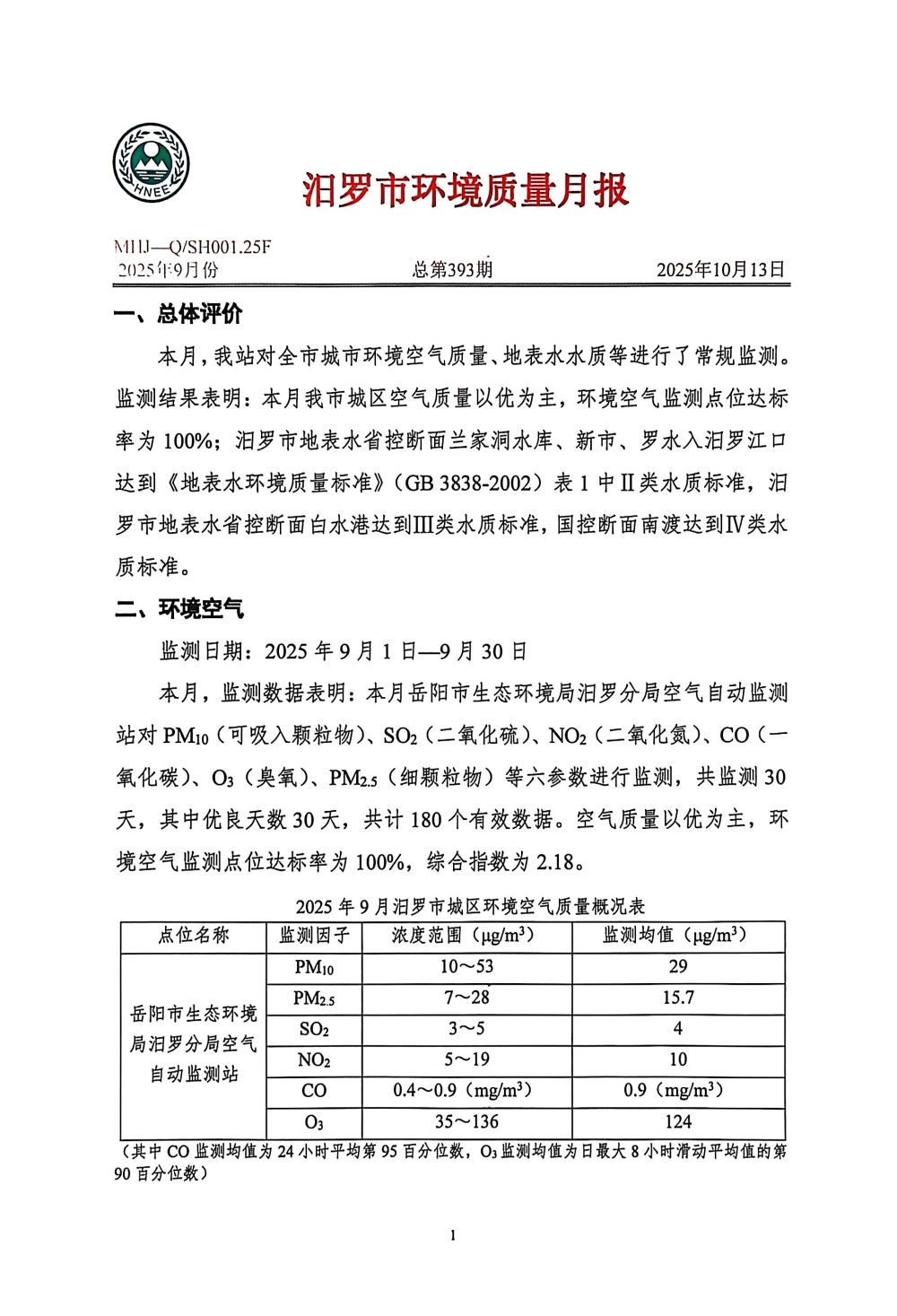 汨罗市环境质量月报(2025年9月份)