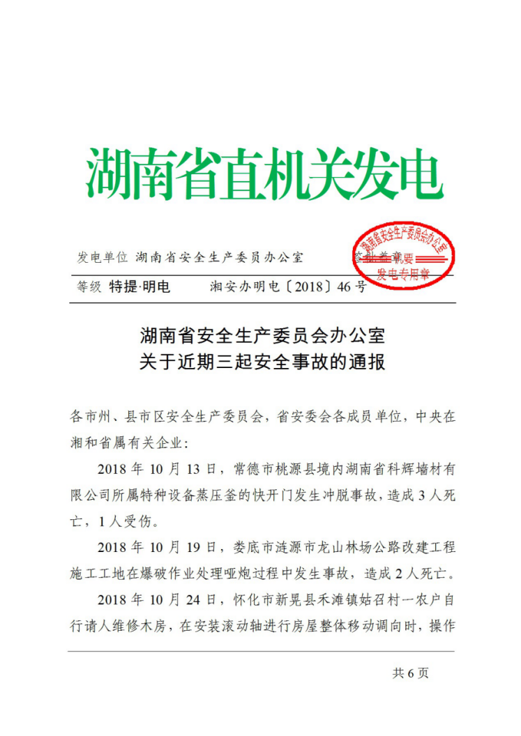 现将湖南省安全生产委员会办公室《关于近期三起安全生产事故的通报》(湘安办明电〔2018〕46号)转发给你们,请按照文件要求,切实贯彻落实省委、省政府领导指示精神,深刻汲取事故教训,结合各自实际,认真抓好贯彻落实。