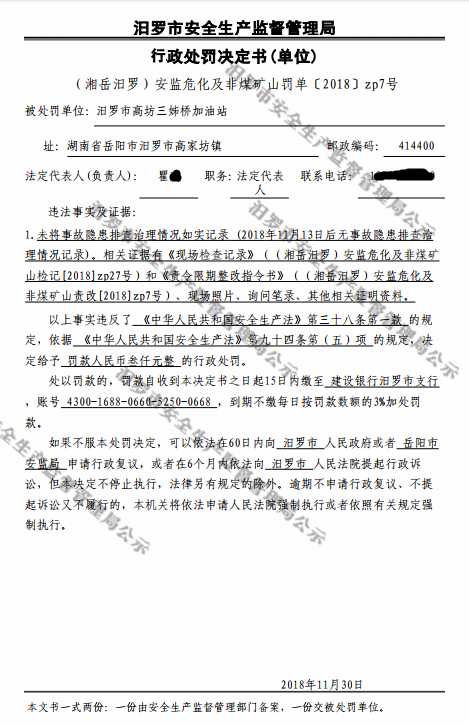 行政处罚决定书(当事人:汨罗市高家坊三姊桥加油站)