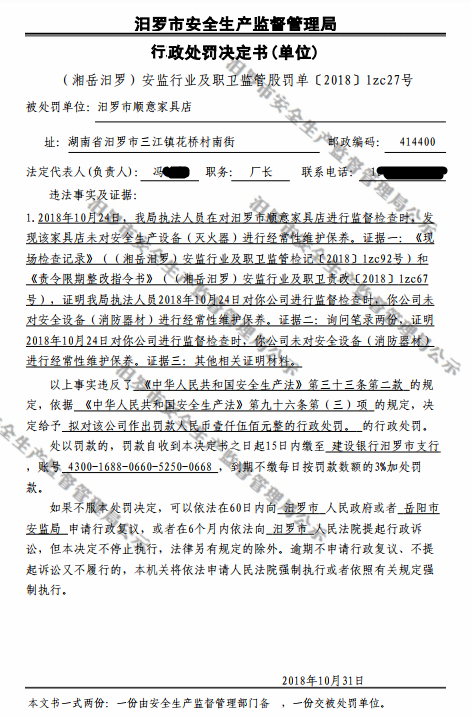 行政处罚决定书(当事人:汨罗市顺意家具店)