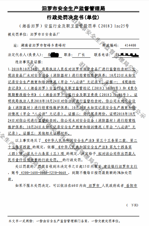 行政处罚决定书(当事人:汨罗市日安食品厂)