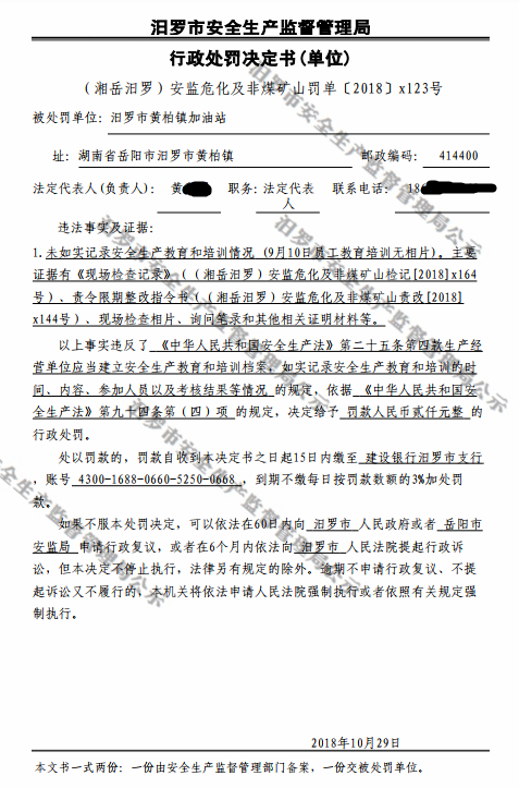 行政处罚决定书(当事人:汨罗市黄柏镇加油站)