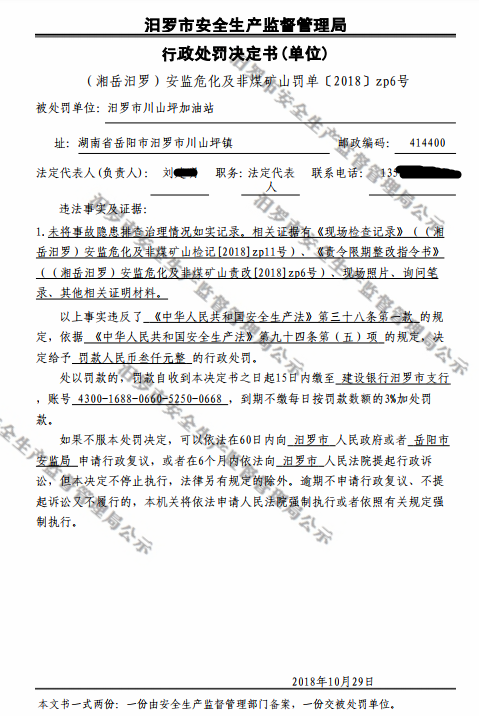 行政处罚决定书(当事人:汨罗市川山坪加油站)