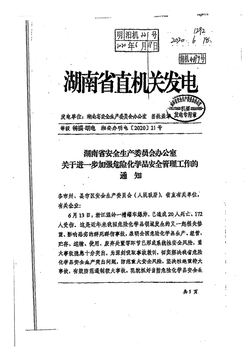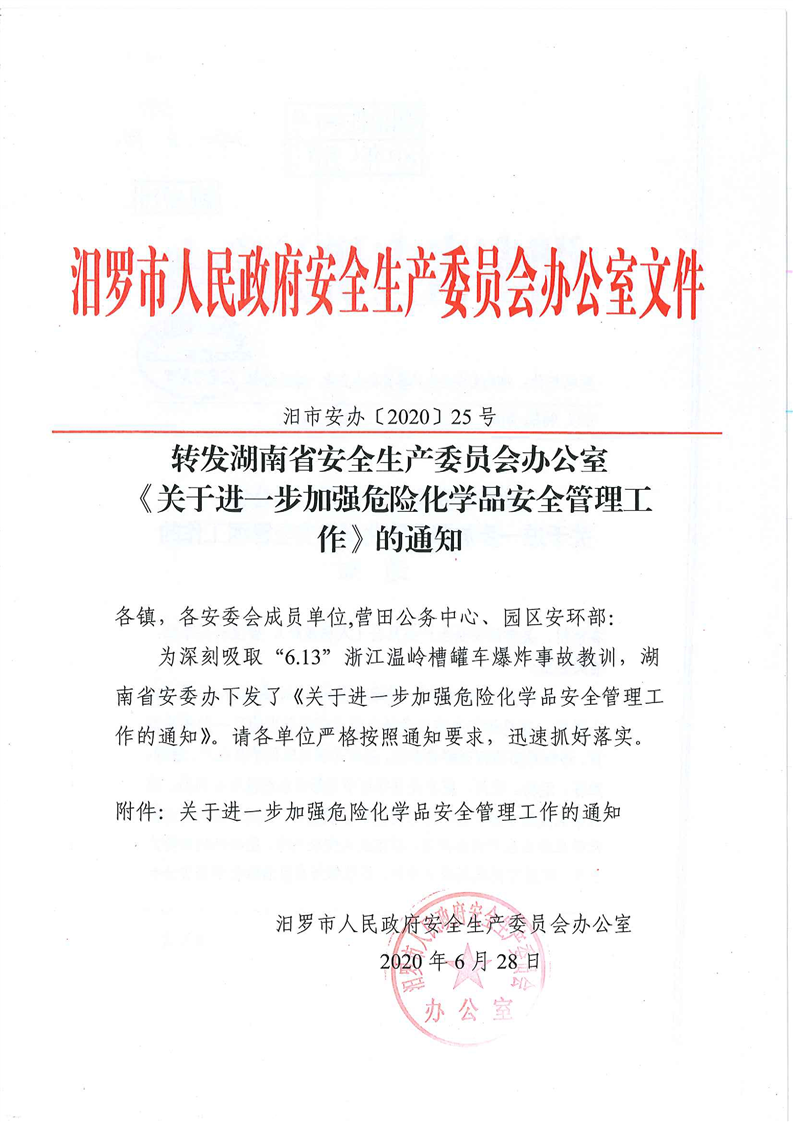 安委办(2020)25号转发湖南省安委办《进一步加强危险化学品安全管理工作》的通知