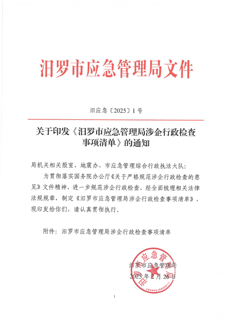 关于印发汨罗市应急管理局涉企行政检查清单的通知