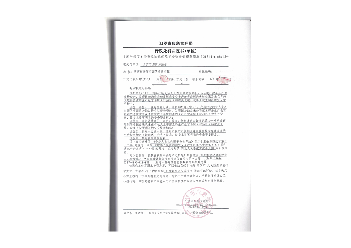 汨罗市汨青加油站行政处罚决定书汨罗市汨新加油站行政处罚决定书