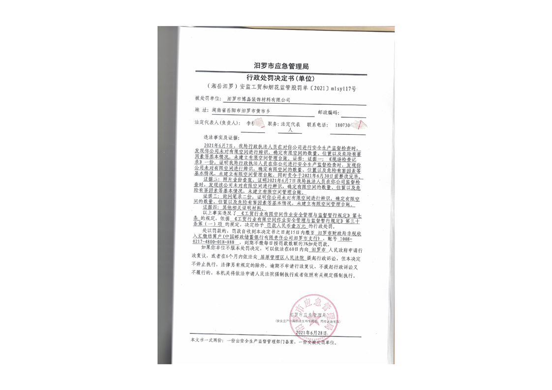 汨罗市博磊装饰材料有限公司行政处罚决定书