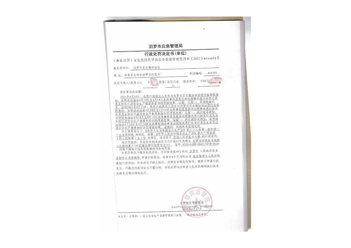 汨罗市京古塘加油站行政处罚决定书1