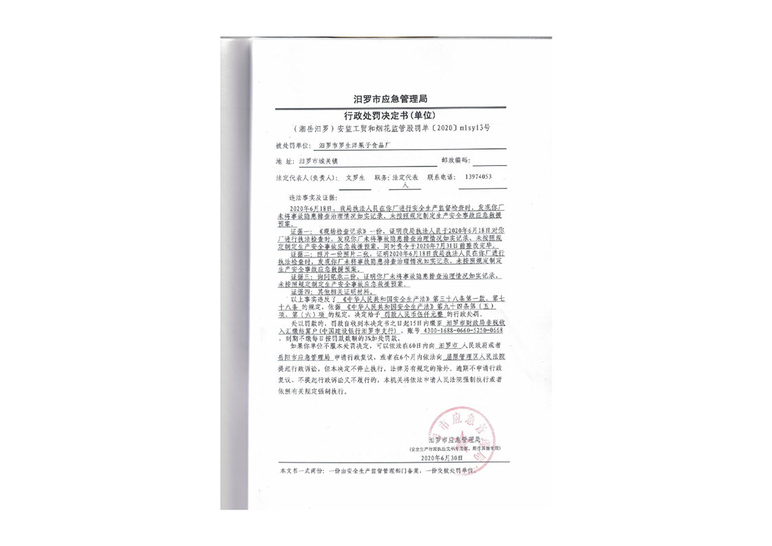 汨罗市罗生洋果子食品厂行政处罚决定书