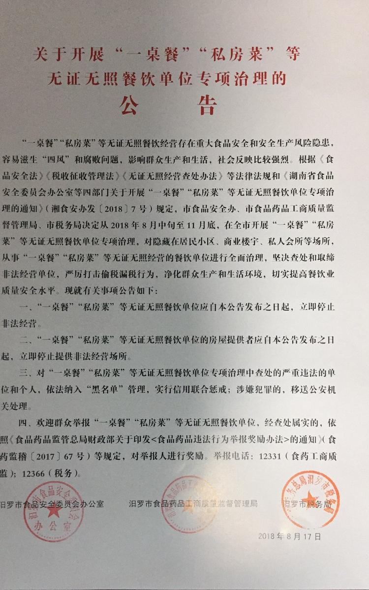 关于开展“一桌餐”“私房菜”等无证无照餐饮单位专项治理的公告