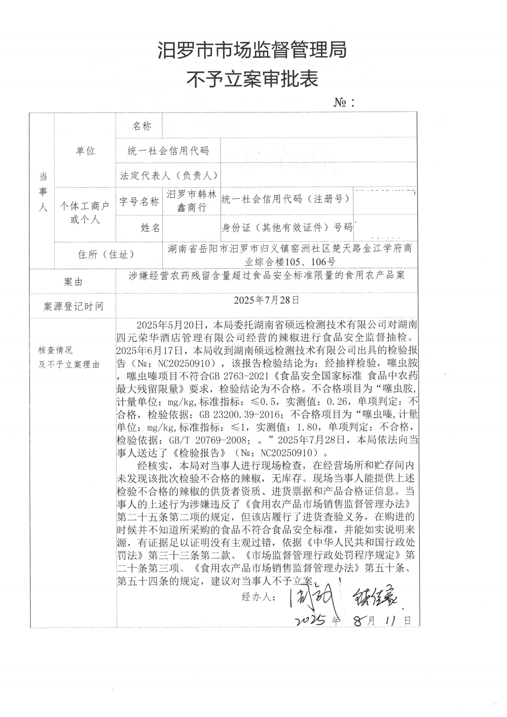 汨罗市市场监督管理局不予立案审批表
