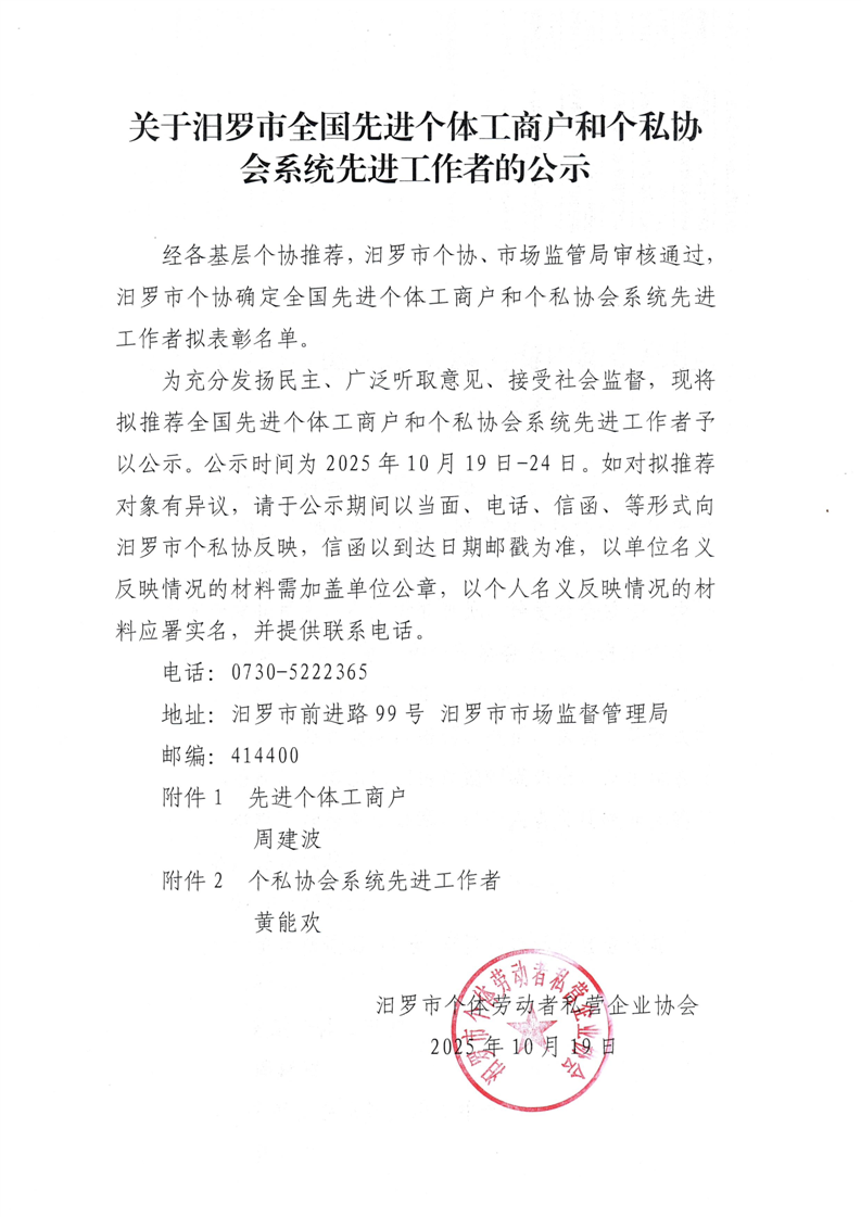 关于汨罗市全国先进个体工商户和个私协会系统先进工作者的公示