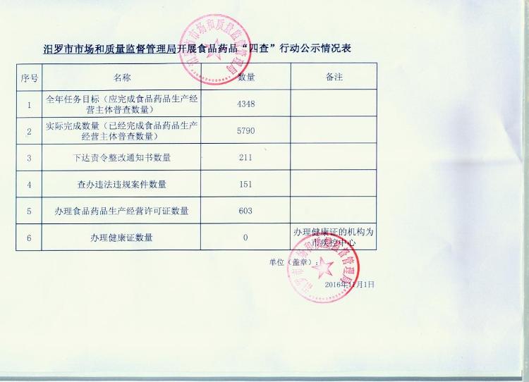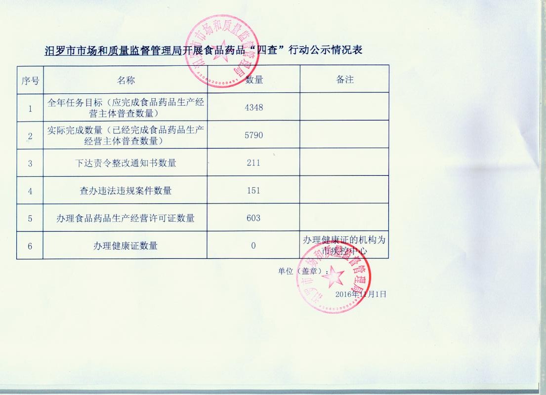 汨罗市市场和质量监督管理局开展食品药品“四查”行动公示情况表