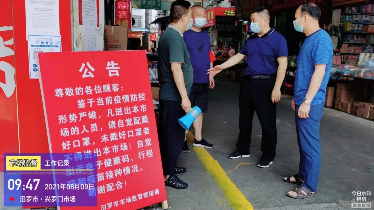 “老板,您好!我们是市场监管局执法人员,今天主要对你们店里疫情防控措施落实情况进行检查,主要检查进店戴口罩、扫码或登记、测温、通风消毒……”这是奋战在一线的汨罗市市场监管执法人员一直挂在嘴边的话,他们走市场、进超市,查记录、看台账,对门店防疫措施落实情况进行检查指导。