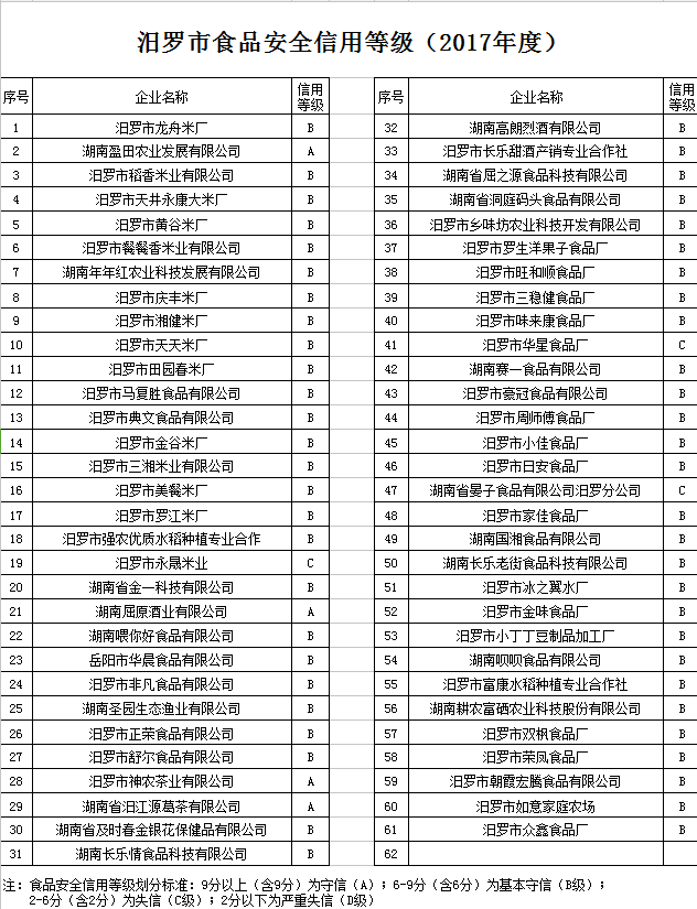 汨罗市食品安全信用等级(2017年度)