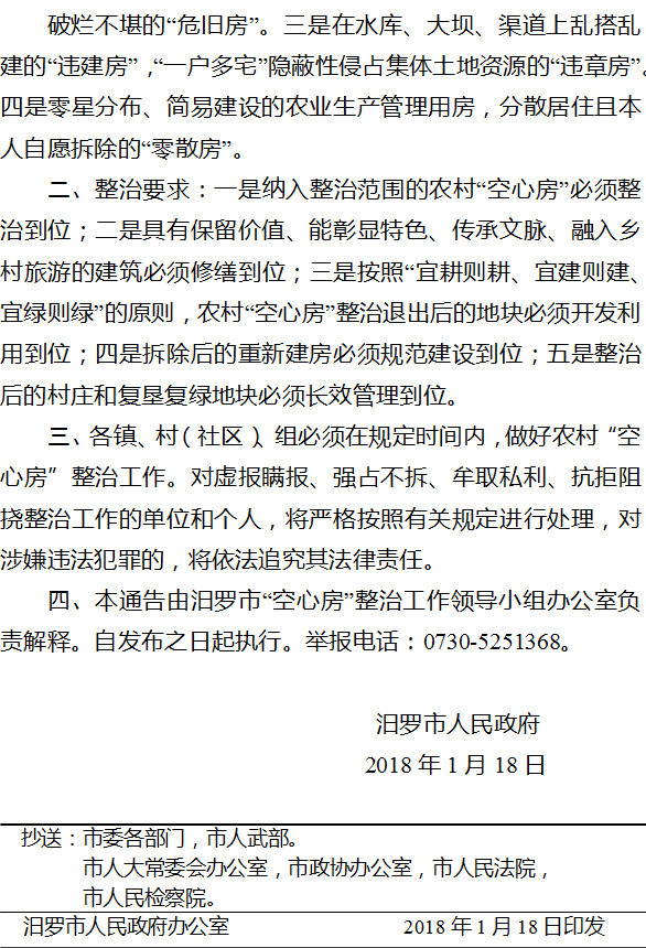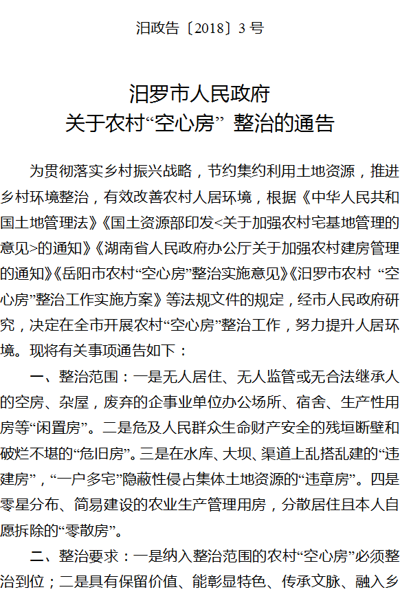 汨罗市人民政府关于农村“空心房” 整治的通告