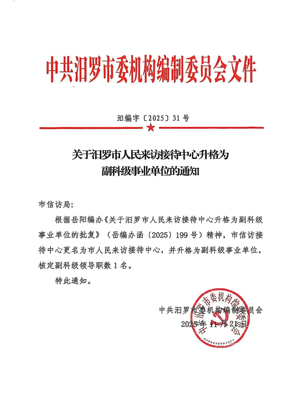 汨罗市信访局转关于汨罗市人民来访接待中心升格为副科级事业单位的通知