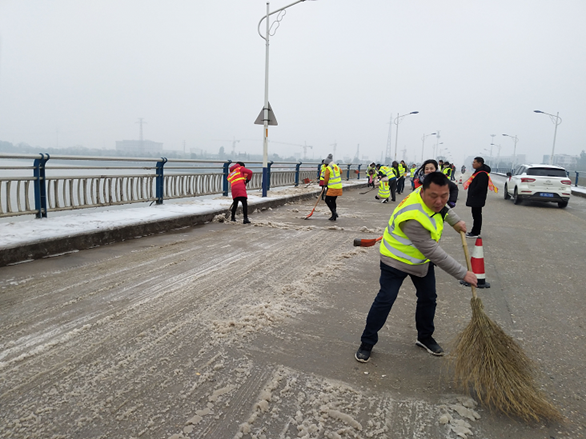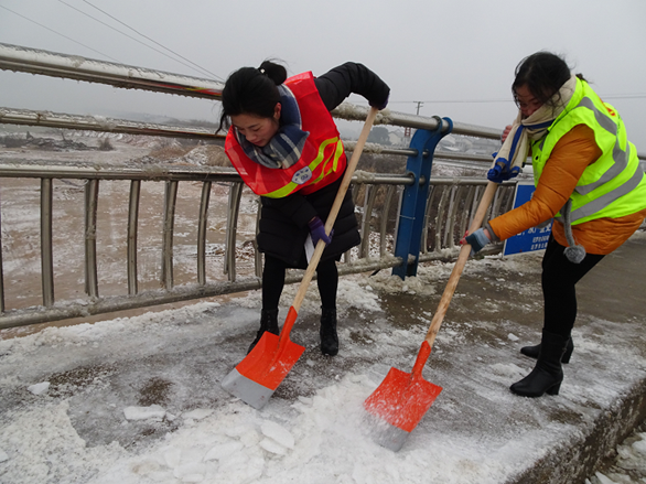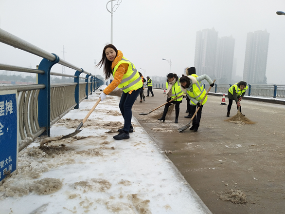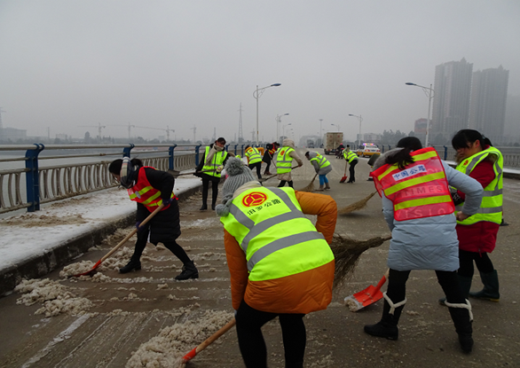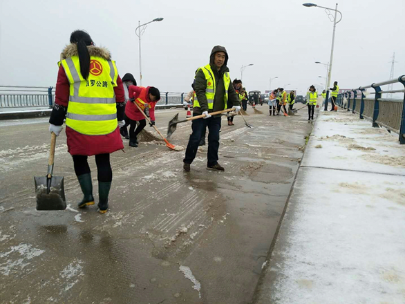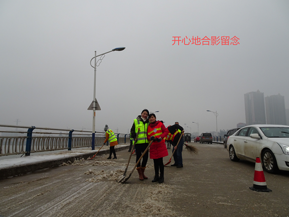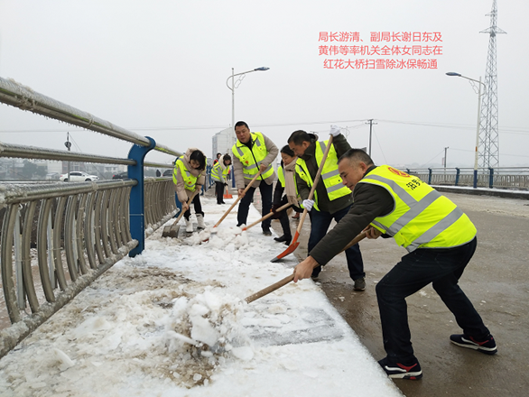 根据天气预报,汨罗26日至29日气温持续走低,全天气温零度以下,极端气温零下6度。为了保障群众出行安全,汨罗境内包括红花大桥等五座大桥内的202公里道路上的冰雪都要清除,汨罗局男同志绝大部分抽到各抗冰抢修分队,两班倒轮流上路,忙着撒融雪除冰,有时同志甚至已连续两个通宵未眠。26日下午一女同胞提议“我们局里男同志这两天太辛苦了。明天我们女同志上,让他们休息半天”,其他女同志齐声呼应。第二天(星期六)8点半,近20余名女同志准时到达办公室,带上铁锹、扫把等除雪工具,身着标志服队列整齐地来到红花桥。桥上寒风刺骨,巾帼们却干得热火潮天。群里的男同事得知消息,也赶来加入到了扫雪除冰的队伍中,当地乡政府负责红花大桥安全的两位干部见状连忙接过铁锹也跟着一起干起来。路过的行人和车辆纷纷点赞,有的还拿出手机拍照,两个小朋友笑眯眯的挥着小手向正在扫雪人我们致意,让寒风中奋战的我们心里暧意洋洋:“谁说拿铁锹锄头的人地位低,今天我就觉得拿着铁锹干活挺自豪”。至11点半,桥面全部清扫干净。局长游清讲到,这个样子至少可以保证6个小时安全畅通。