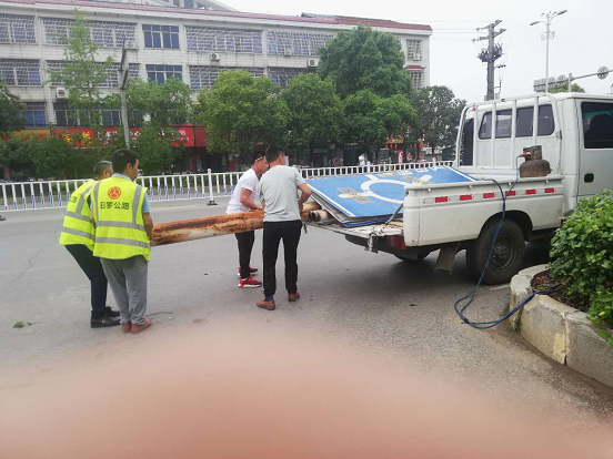 在接到热线电话后,工务股迅速安排一线养护工人前往事发路段进行察看并处理。由于零部件生锈等原因情况特殊,考虑到过往行人行车的安全,养护工人将标牌全部卸下,并拖离事发路段。