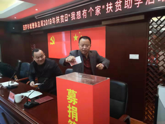 10月17日是我国第6个扶贫日,也是第27个国际贫困日,汨罗市城市管理和综合执法局组织全体干职工开展“我想有个家”扶贫助学公益募捐活动,为正处于拼博中的寒门学子送去浓浓爱心。