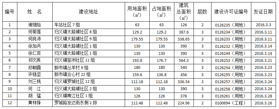 2016年3月份城市规划区私人住宅建设规划许可证发放名单