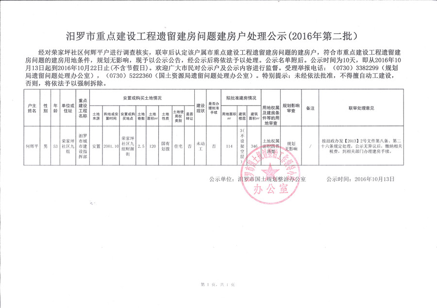 汨罗市重点建设工程遗留建房问题建房户处理公示(2016年第二批)
