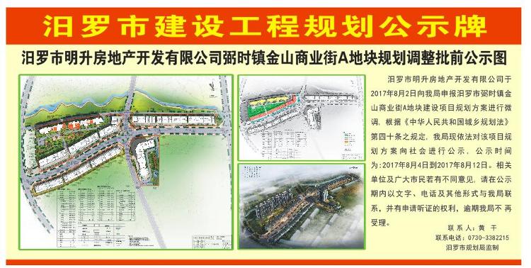 汨罗市明升房地产开发有限公司弼时镇金山商业街A地块规划调整批前公示