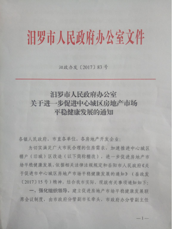 《关于进一步促进中心城区房地产市场平稳健康发展的通知》汨政办发[2017]83号
