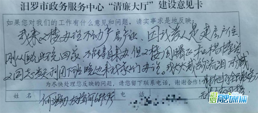 汨罗融媒体讯(通讯员 吴佳欣)近日,汨罗市不动产登记中心收到办事群众亲笔书写的感谢意见卡。此前,该中心接到群众求助,反映其家人因身体原因行动不便,无法前往政务大厅办理不动产相关手续。了解情况后,中心工作人员主动利用休息时间提供上门服务,耐心讲解政策、确认办理流程,以“干部跑”“数据跑”替代“群众跑”,顺利办结业务。群众深受感动,亲手写下感谢信,字里行间满是诚挚的赞许。