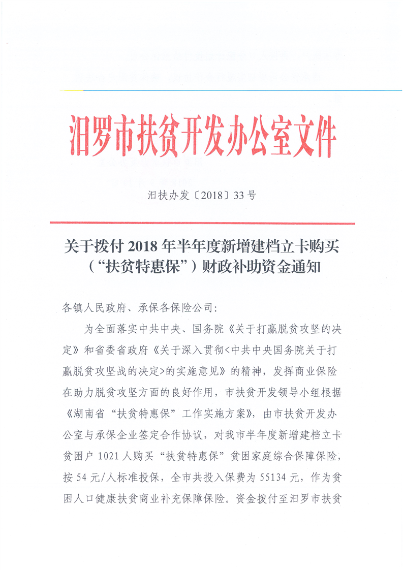 关于拨付2018年半年度新增建档立卡购买(特惠保)财政补助资金的通知