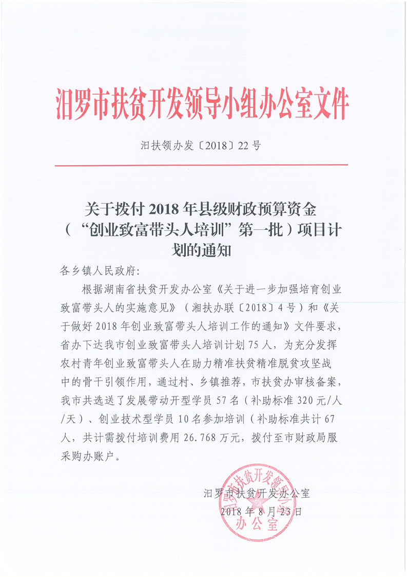关于拨付2018年县级财政预算资金(创业致富带头人培训第一批)项目计划的通知