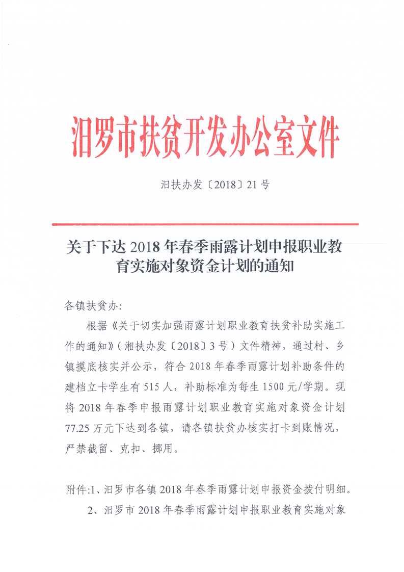 关于下达2018年春季雨露计划职业教育实施对象资金计划的通知