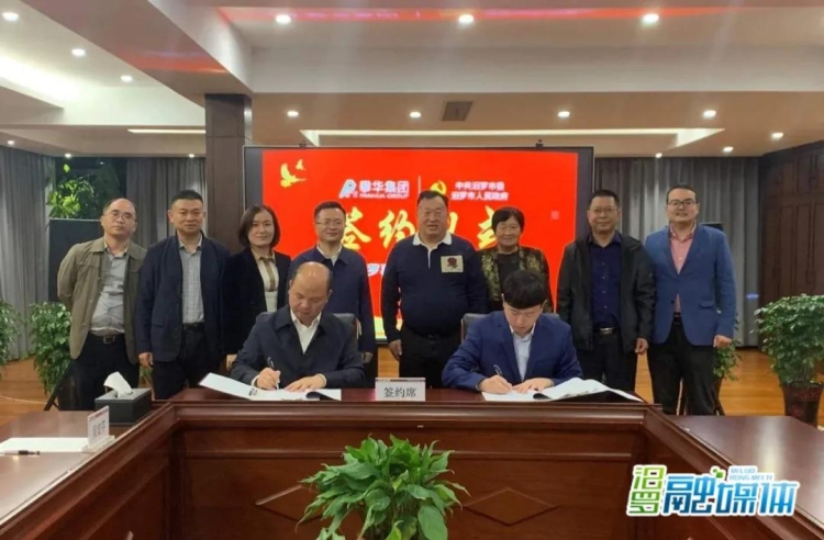 喻文(后排左四)、李兴华(后排左五)等现场见证签约,刘勇(前排左一)与攀华集团相关负责签订合作协议