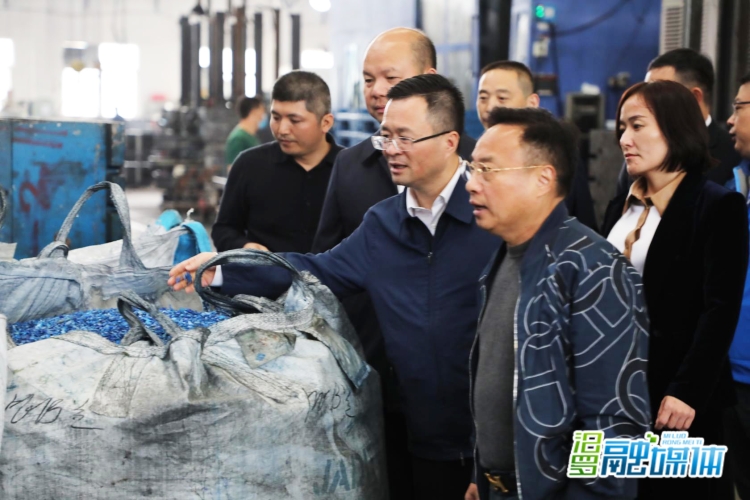 喻文(左三)现场考察上海鑫鹏塑料制品有限公司,与企业负责人深入交流