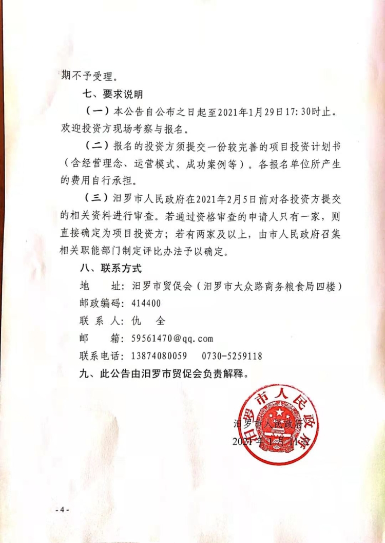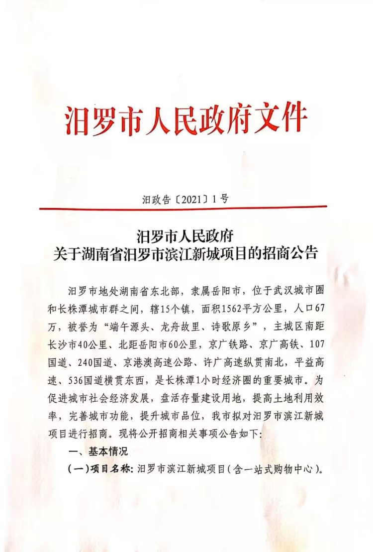 汨罗市人民政府关于湖南省汨罗市滨江新城项目的招商公告