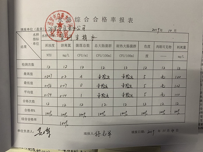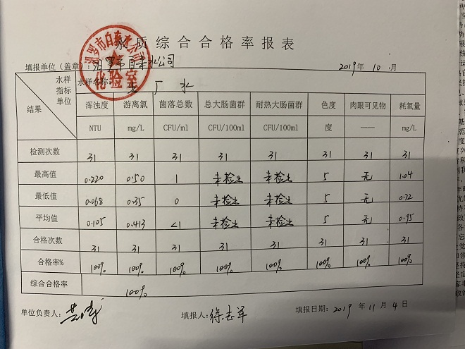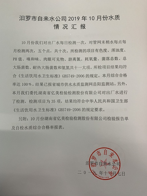 汨罗市自来水公司2019年10月份水质情况汇报
